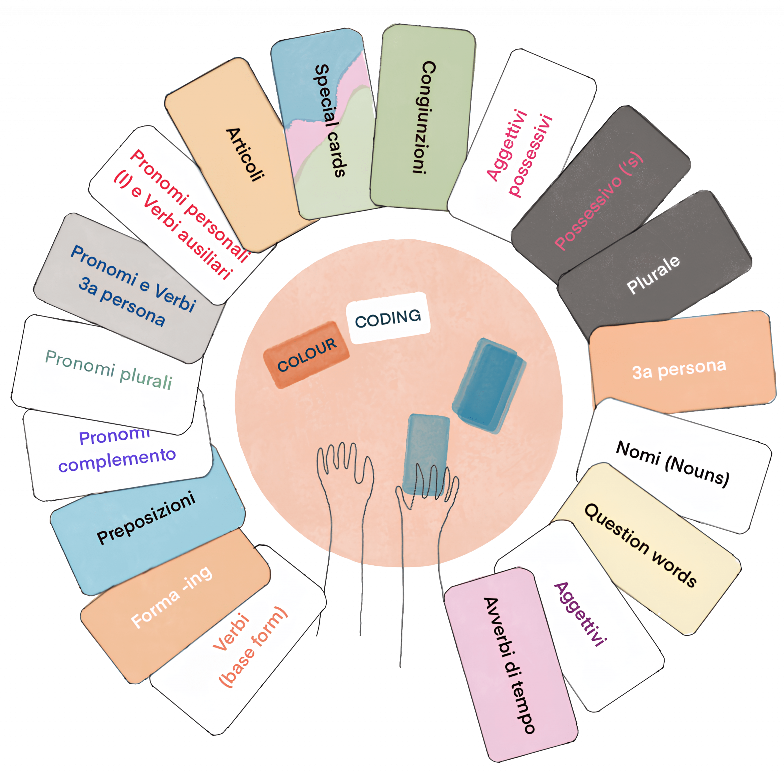 Le flashcards colorate permettono di visualizzare le strutture linguistiche, costruire frasi e collaborare in modo naturale e coinvolgente.
